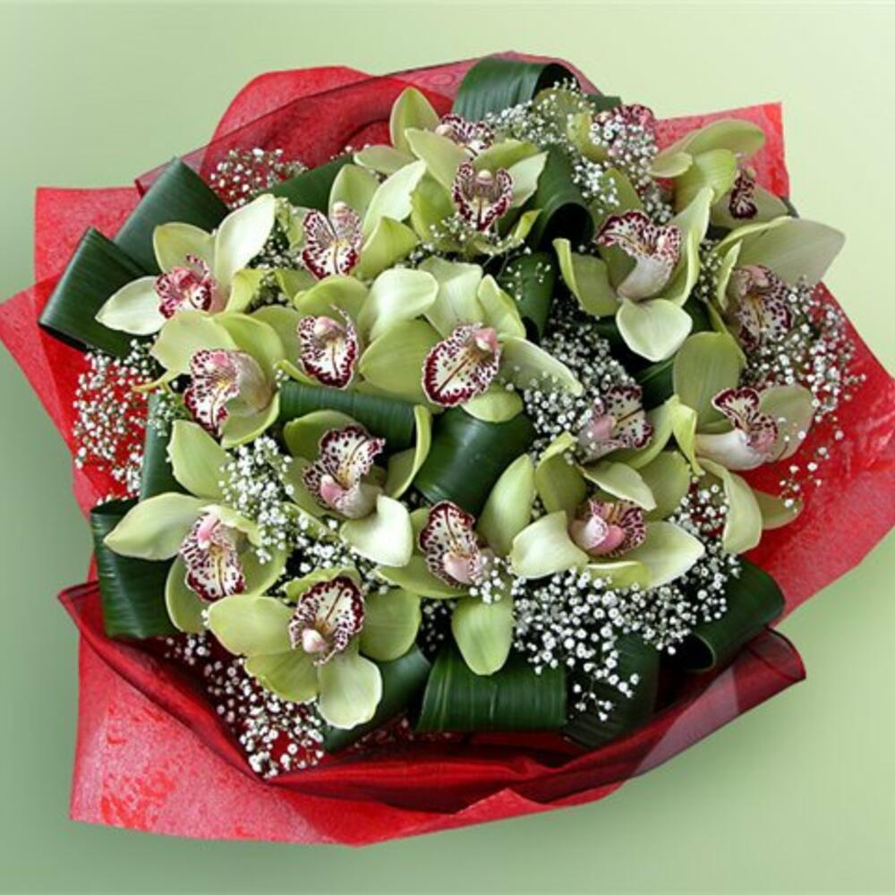 орхидея соцветия – 13 шт.Гипсофила – 3 шт.Аспидистра – 5 шт.