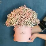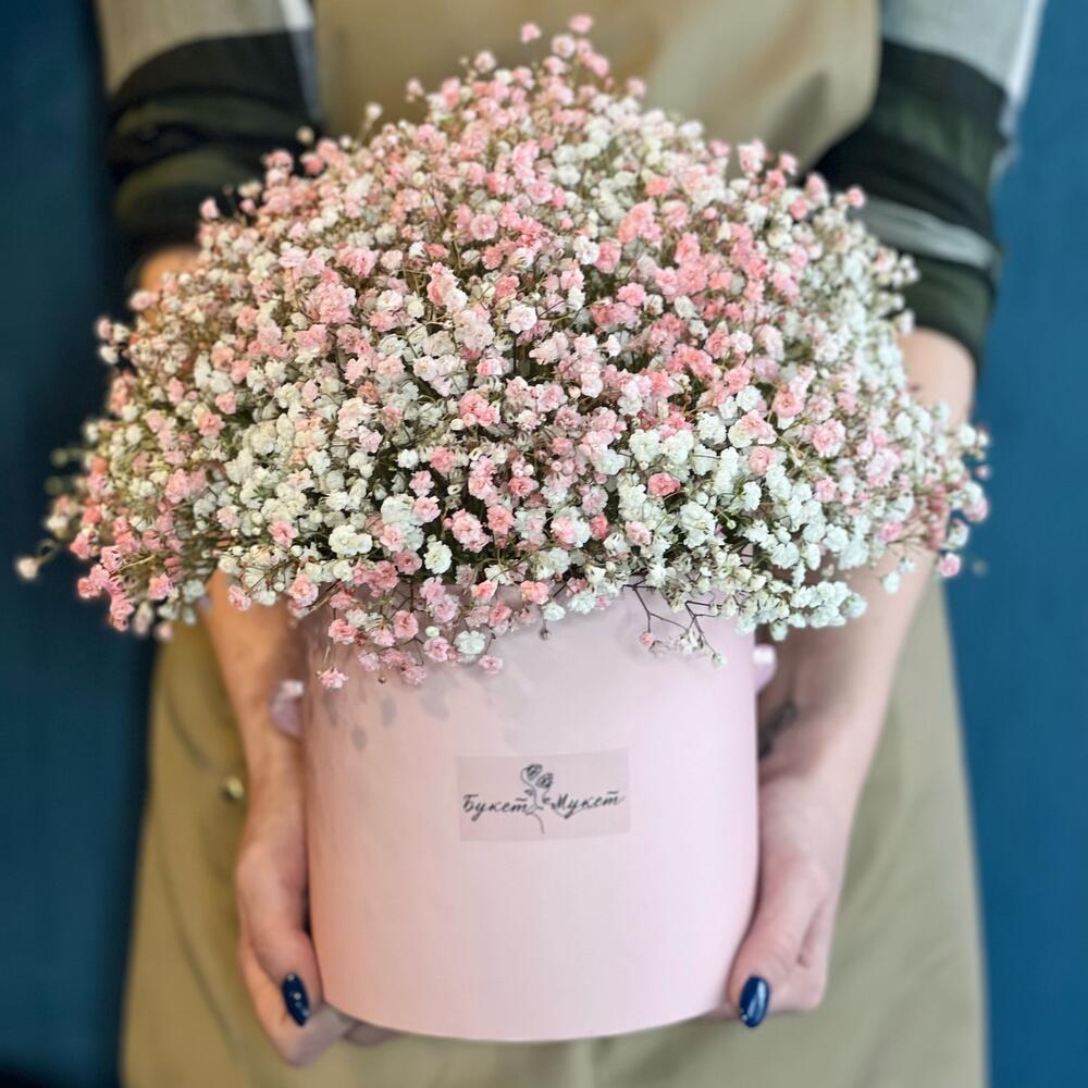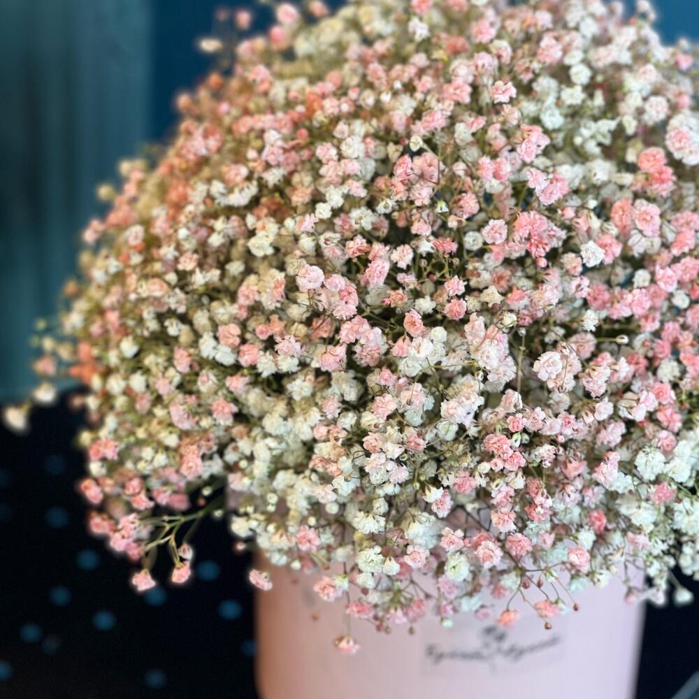 “Сиреневый туман” – композиция из гипсофилы в шляпной коробке