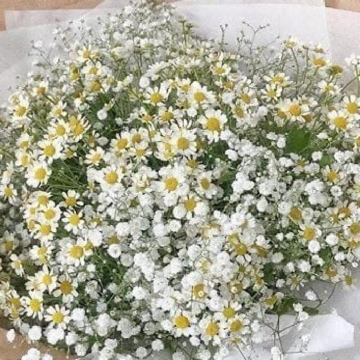 Гипсофила – 5 шт.Матрикария – 8 шт.Упаковка дизайнерская – 4 шт.Лента атласная – 2 шт.
