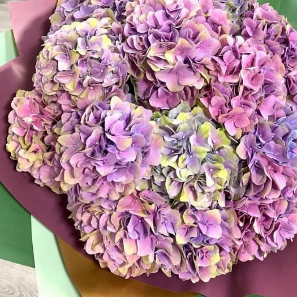 Гортензия фиолетовая – 15 шт.Упаковка дизайнерская – 2 шт.Лента атласная – 2 шт.Открытка – 1 шт.хорошее настроение – 100 шт.инструкция по уходу за цветами – 1 шт.коробка переноска – 1 шт.клизал – 1 шт.