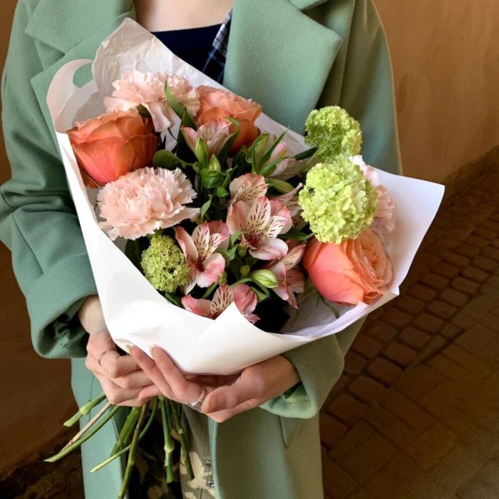 Альстромерия – 2 шт.Вибурнум – 1 шт.Гвоздика розовая – 2 шт.Рускус сочи – 2 шт.Роза кахала – 3 шт.Авторская упаковка – 1 шт.