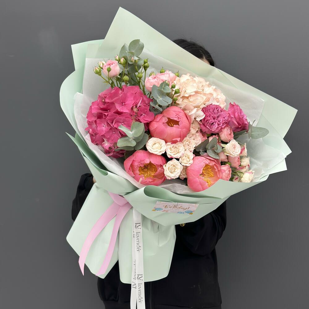 Гвоздики, Лизиантусы, Розы, Тюльпаны