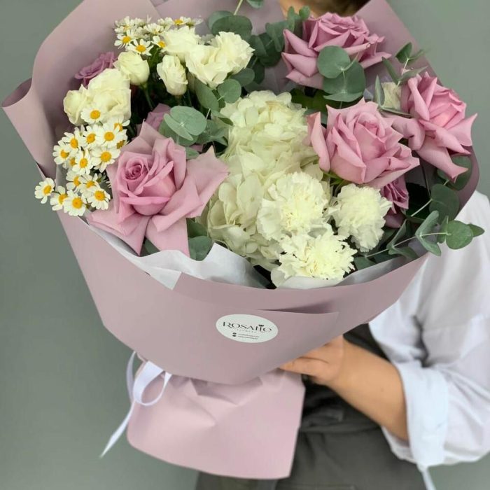 Альстромерии, Гвоздики, Кустовые розы, Лизиантусы, Розы, Хризантемы