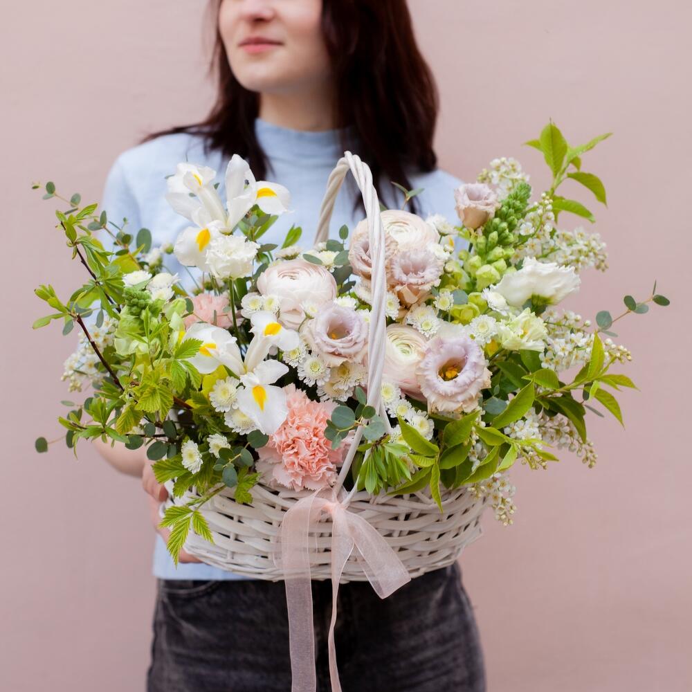 Корзина плетеная – 1 шт.Ранункулюс (белый) – 3 шт.Хризантема кустовая – 3 шт.Ирис – 2 шт.Лизиантус – 4 шт.Диантус – 4 шт.Антуриум – 4 шт.