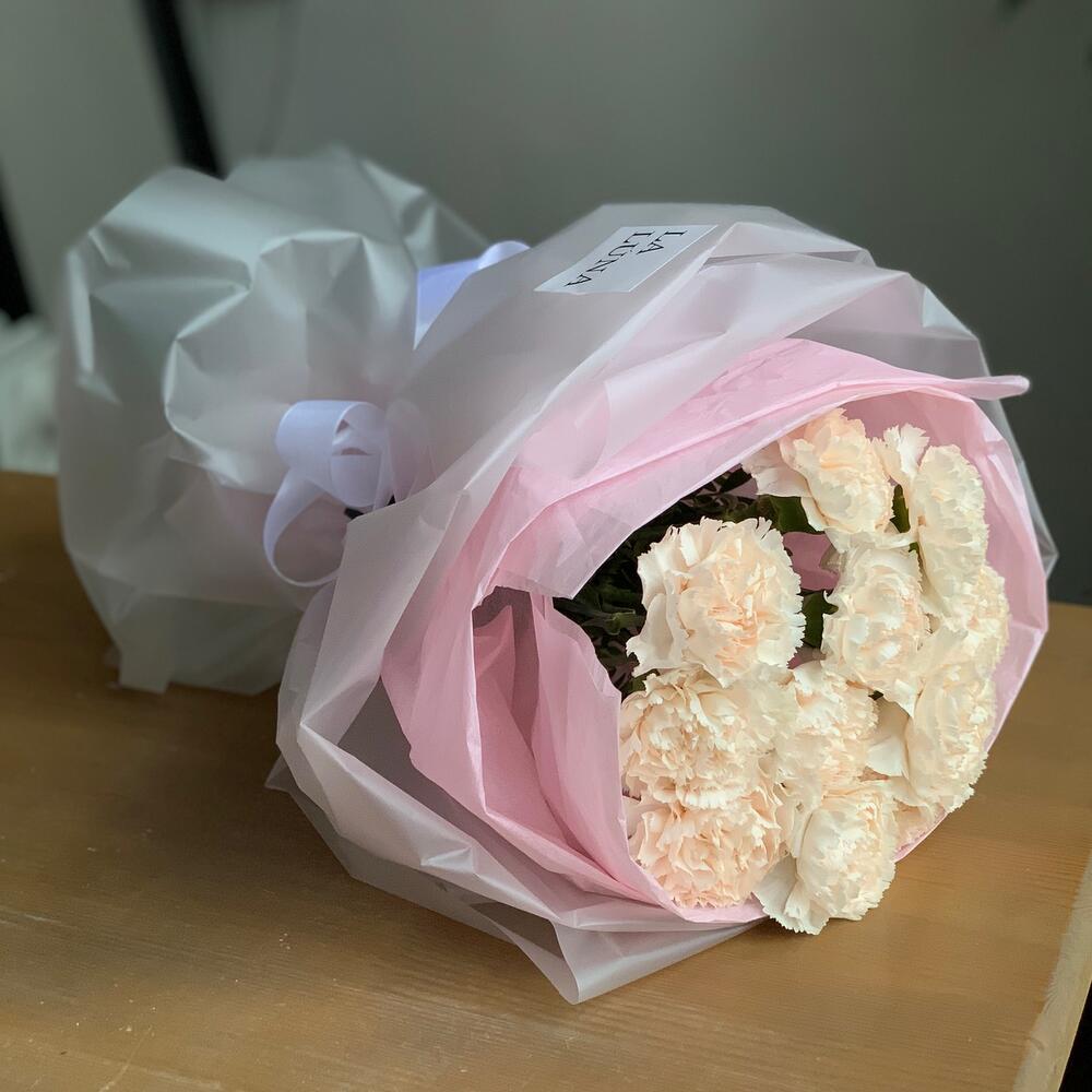 Гвоздика кремовая – 11 шт.Лента атласная – 1 шт.Упаковка дизайнерская – 2 шт.Кризал (подкормка) – 1 шт.Аквапак – 1 шт.инструкция по уходу за цветами – 1 шт.транспортировочная упаковка – 1 шт.