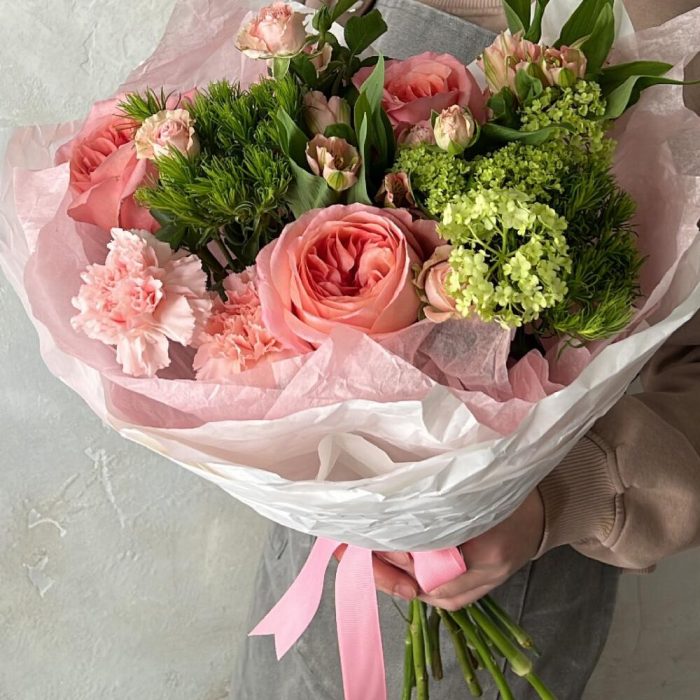 Альстромерия – 2 шт.Кустовая роза – 2 шт.Диантус – 2 шт.Роза пионовидная – 3 шт.Упаковка дизайнерская – 1 шт.грин трикс – 3 шт.