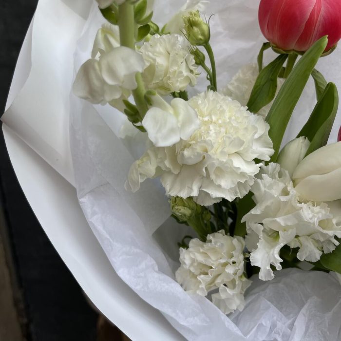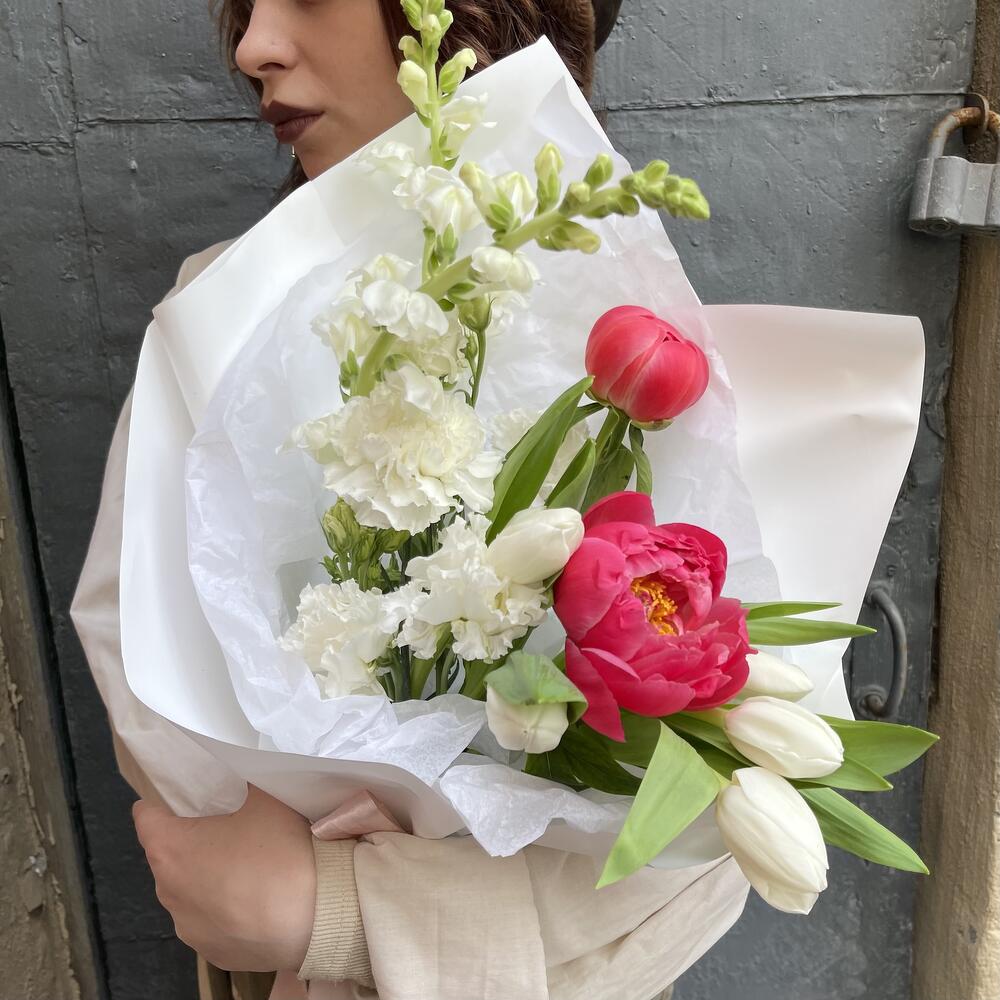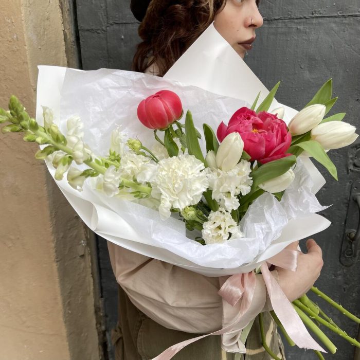 Гвоздики, Лизиантусы, Розы, Тюльпаны