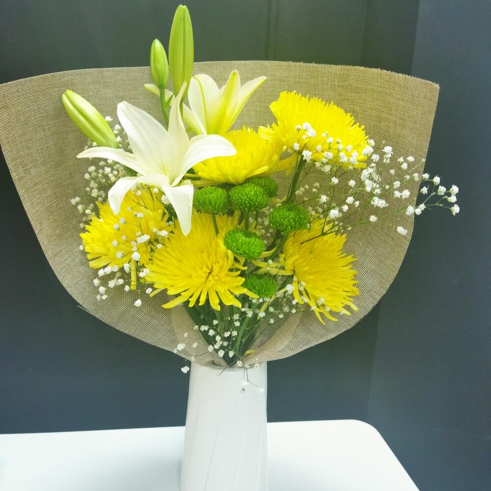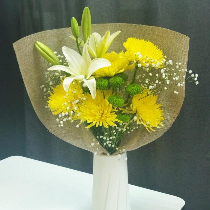 Лилия белая – 1 шт.Хризантема – 5 шт.Хризантема кустовая – 1 шт.Гипсофила – 2 шт.Упаковка – 1 шт.