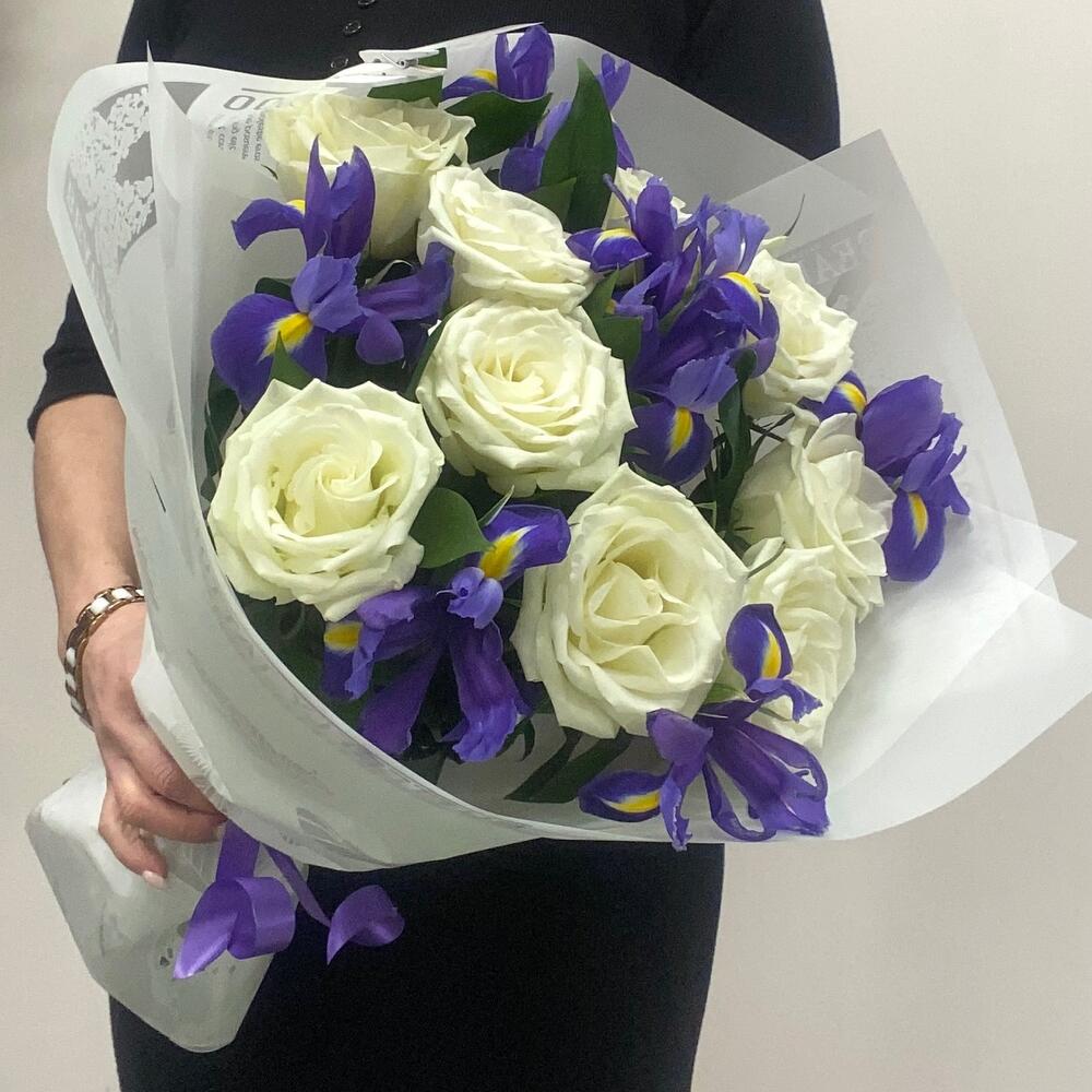розы – 9 шт.ирисы – 6 шт.Рускус сочи – 9 шт.Упаковка дизайнерская – 1 шт.Лента – 1 шт.