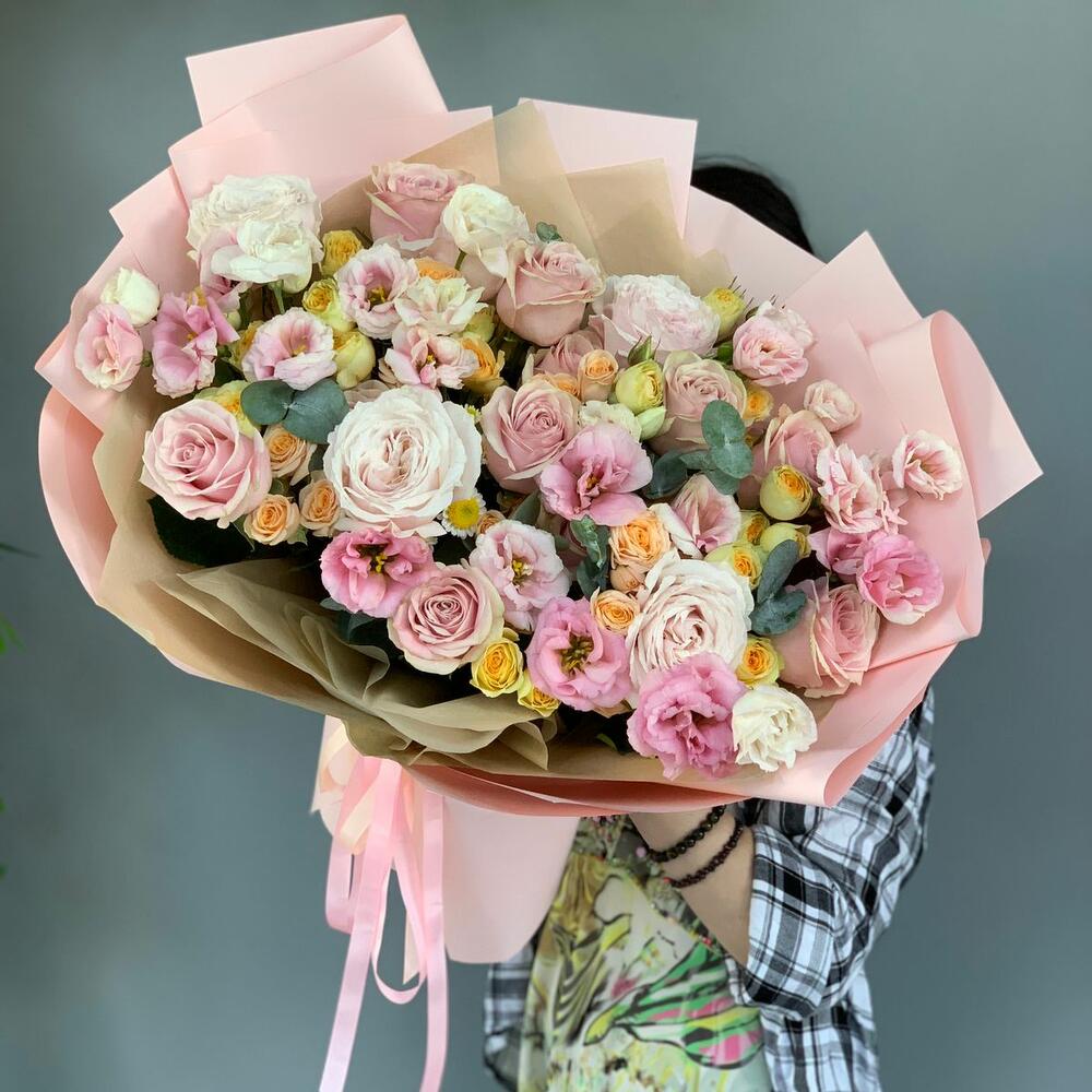 Альстромерии, Гвоздики, Кустовые розы, Лизиантусы, Розы, Хризантемы