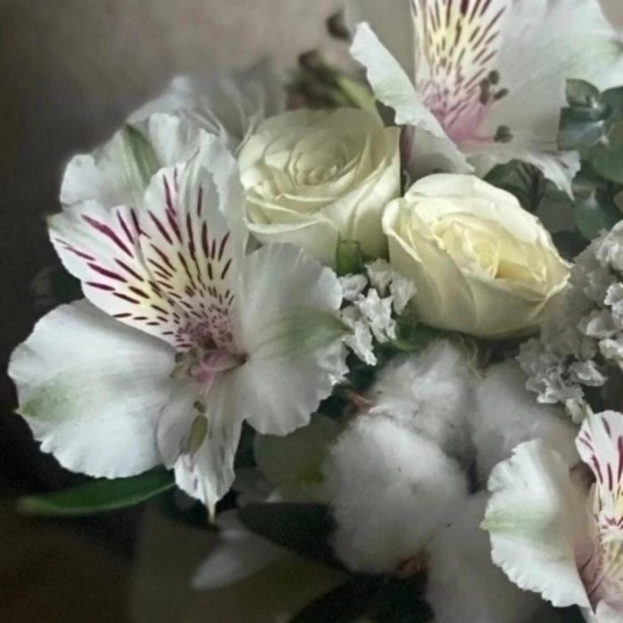 Роза – 1 шт.Кустовая роза – 3 шт.Альстромерия – 3 шт.Хлопок натуральный – 3 шт.Лизиантус – 2 шт.Статица – 1 шт.Эвкалипт – 1 шт.Шляпная коробка – 1 шт.Оазис флористический – 1 шт.