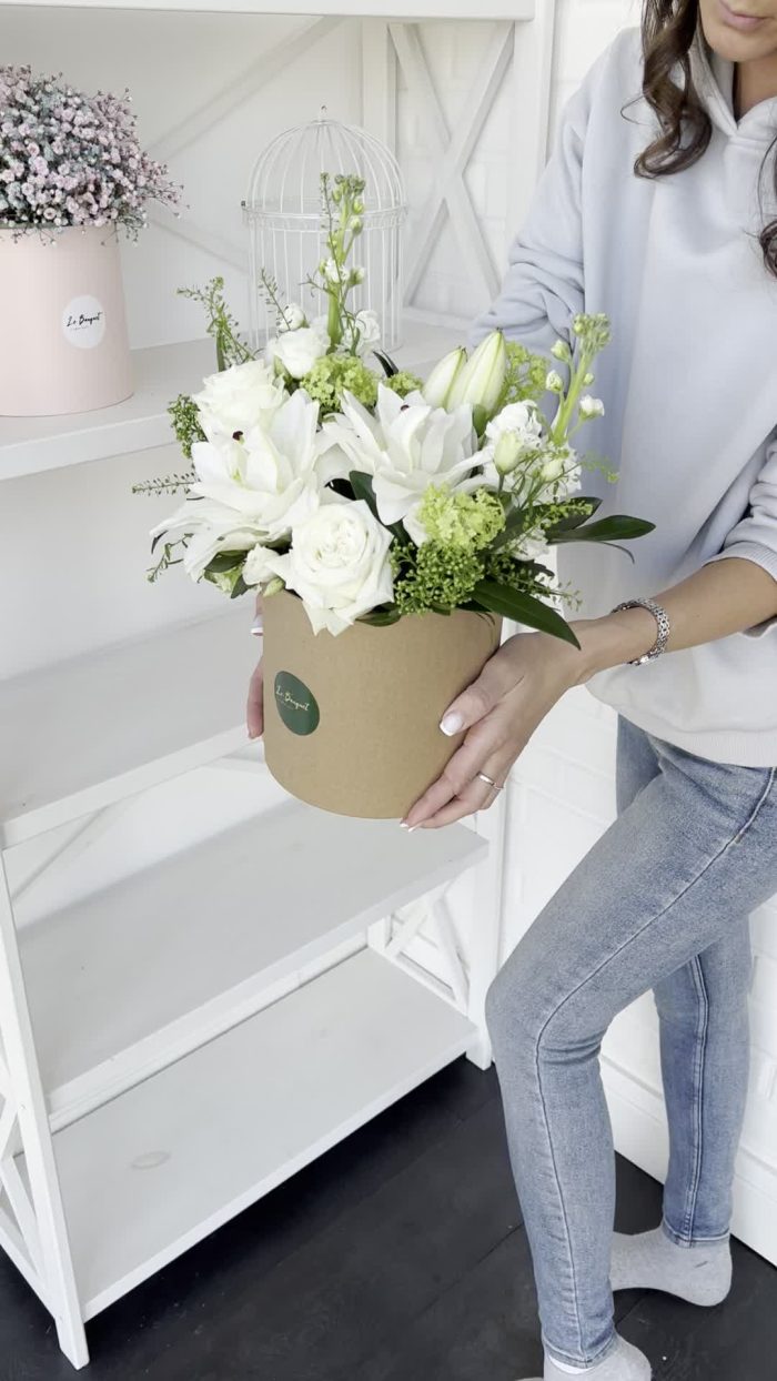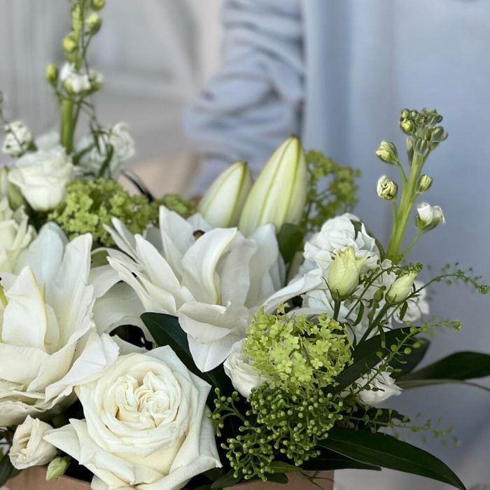Белоснежная композиция с лилиями и розами