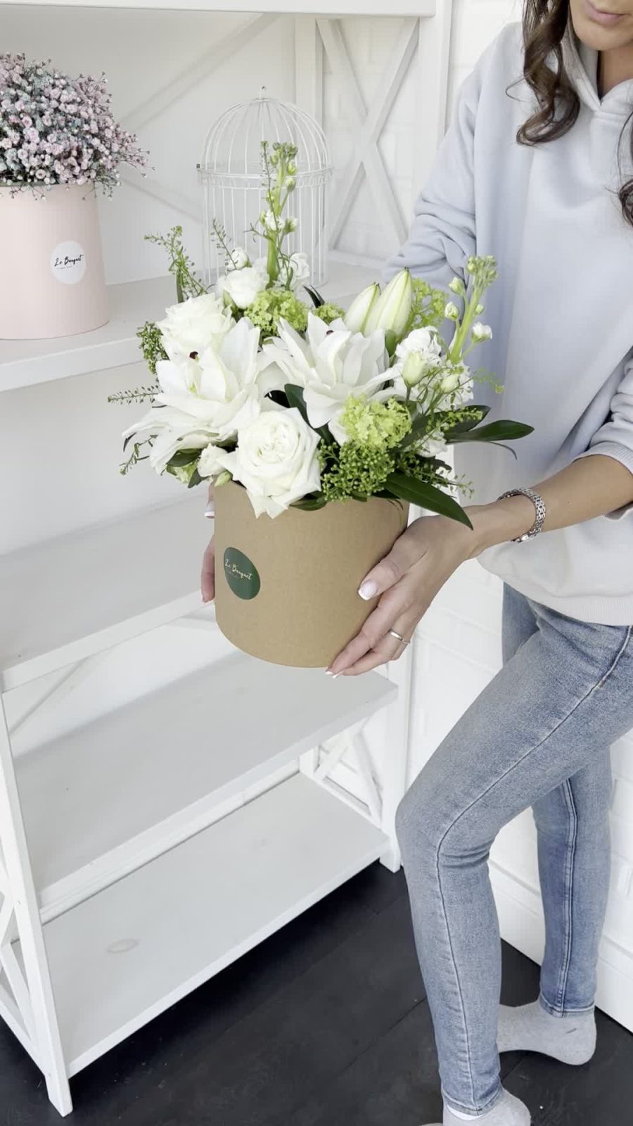 Вибурнум – 3 шт.Лизиантус – 4 шт.Маттиола – 2 шт.Шляпная коробка – 1 шт.Скиммия – 3 шт.Гринбелл – 2 шт.Оазис флористический – 1 шт.лилия дабл – 2 шт.