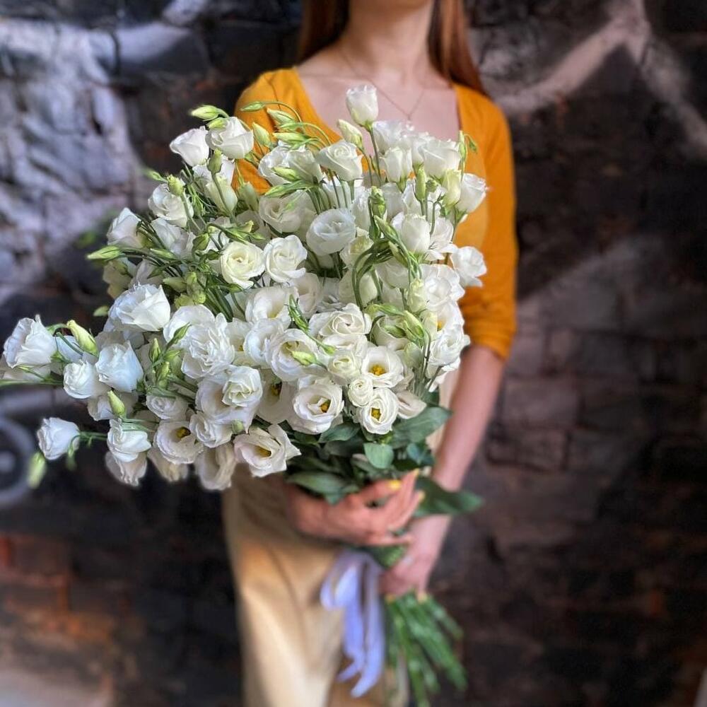 Букет из 21 белой эустомы (лизиантусов) в стильной упаковке “Снежанна”