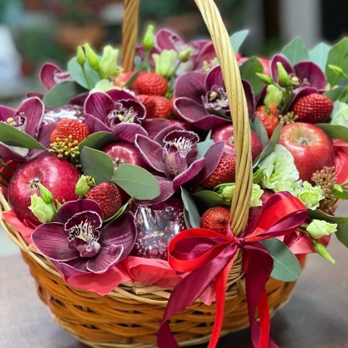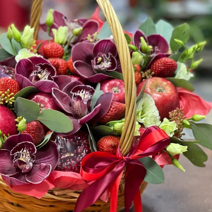 Гранат – 3 шт.яблоки красные – 9 шт.Клубника – 10 шт.Орхидея Цимбидиум – 7 шт.эустома светлая – 11 шт.Корзина – 1 шт.Оазис флористический – 2 шт.Тишью – 5 шт.эвкалипт ветки мини – 7 шт.Лента атласная – 2 шт.работа флориста – 1 шт.