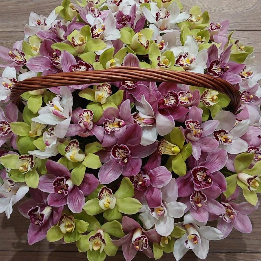 Орхидея Цимбидиум – 5 шт.Зелень – 20 шт.Корзина – 1 шт.Оазис – 3 шт.