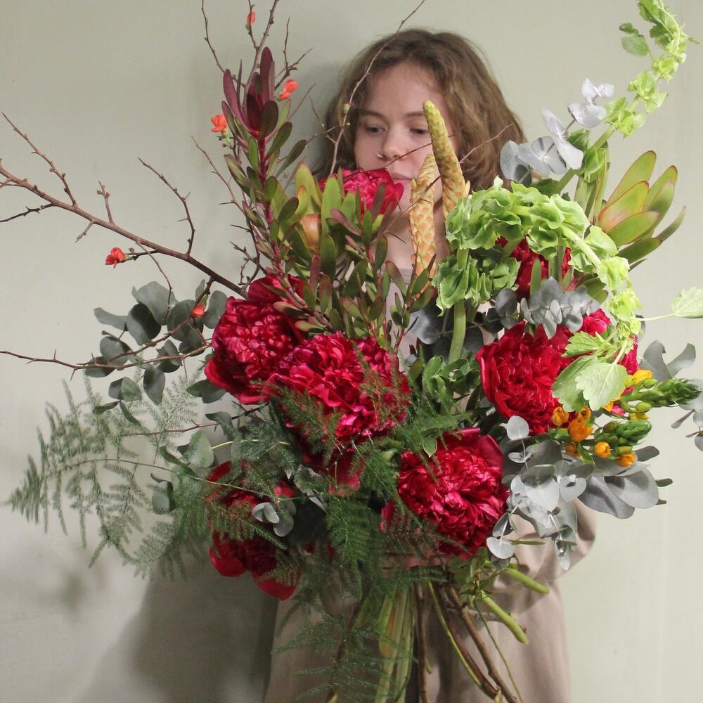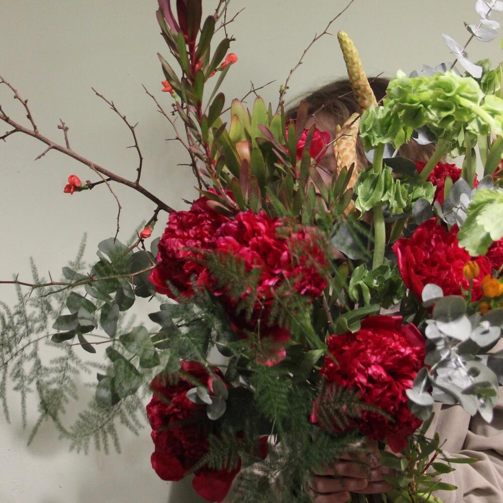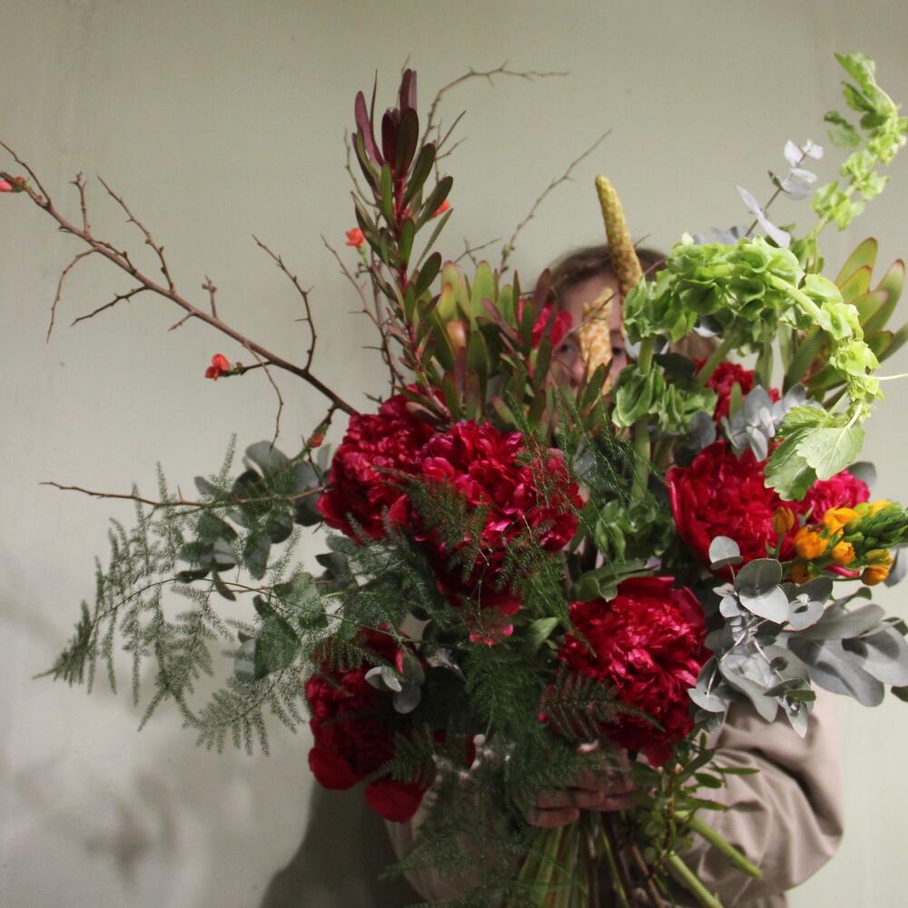 Лента – 1 шт.Пион – 9 шт.Эвкалипт – 7 шт.Орнитогалум – 2 шт.ирландский колокольчик – 2 шт.ветки аспарагуса – 3 шт.левкакендрон – 3 шт.