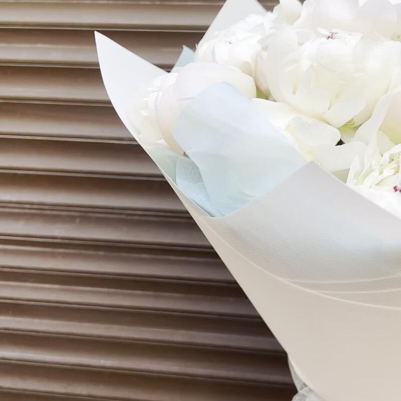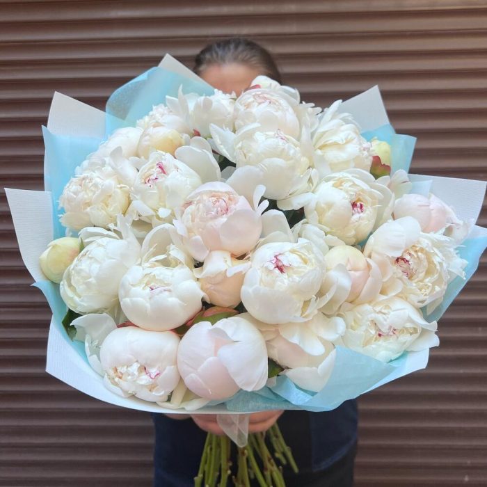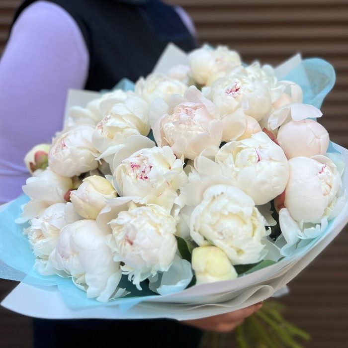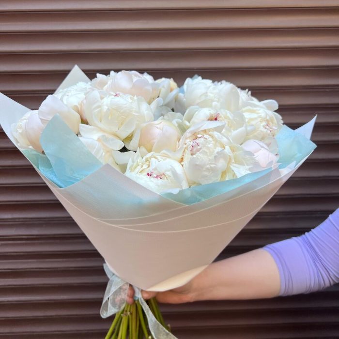 Лента – 2 шт.Тишью – 3 шт.Дизайнерская упаковка – 3 шт.пион белый премиум – 25 шт.