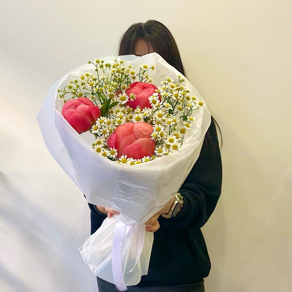 Пион коралл шарм – 3 шт.Матрикария – 5 шт.Упаковка дизайнерская – 1 шт.