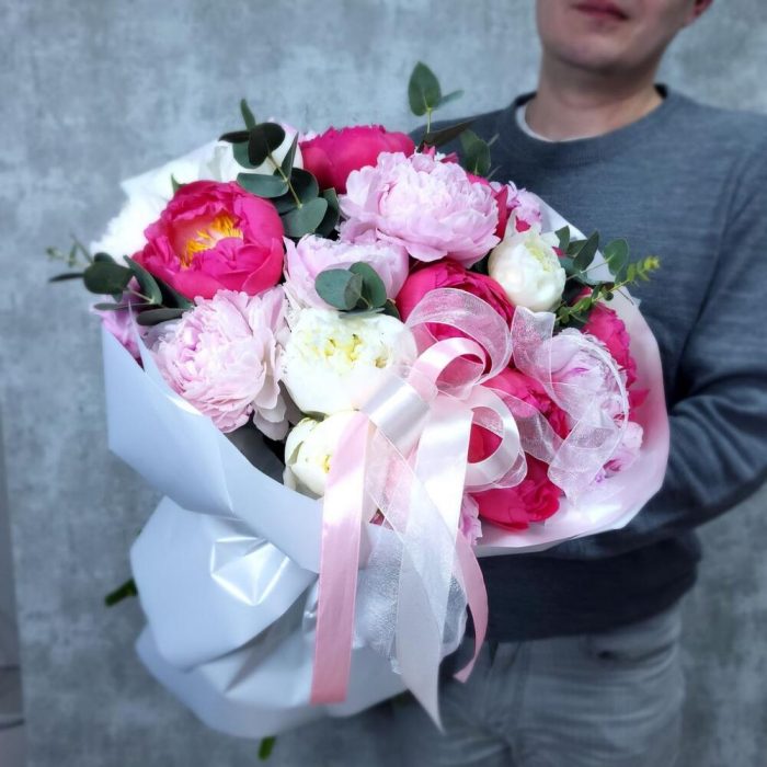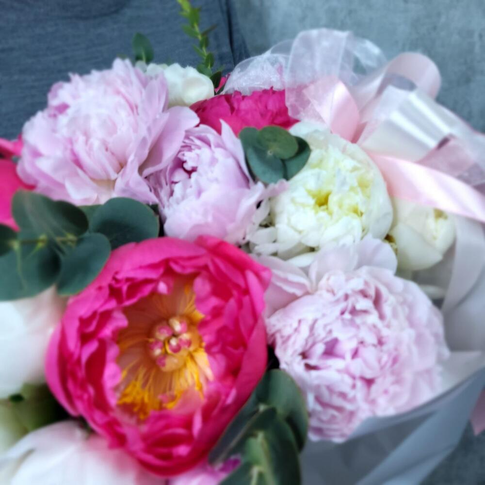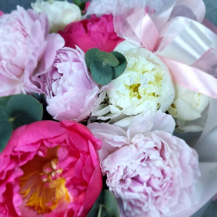 Роскошь пионов в одном букете из 3 сортов пионов. Нежно розовые пионы Сара Бернар, ароматные белые пионы Дюшес и сочные коралловый Sunrises