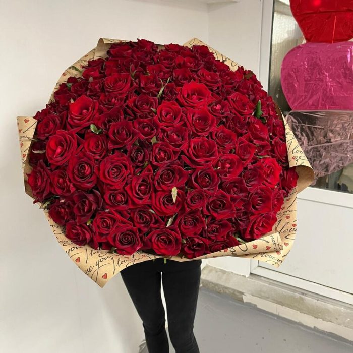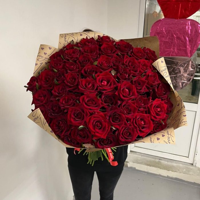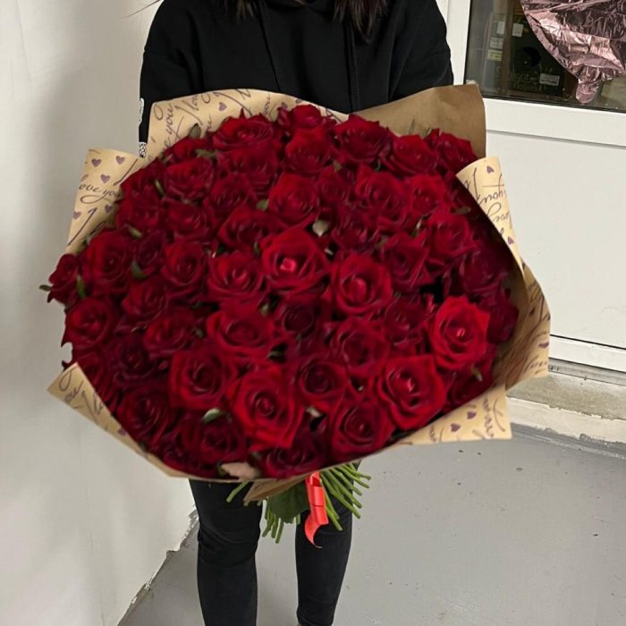 розы эквадор (60 см) – 101 шт.Упаковка – 2 шт.Лента атласная – 1 шт.