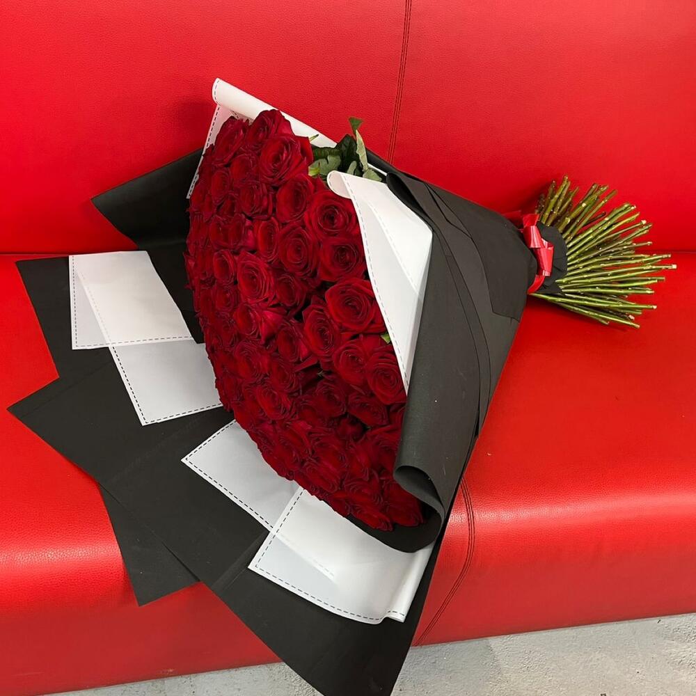 розы элигантные ароматные – 101 шт.Упаковка дизайнерская – 2 шт.Лента атласная – 1 шт.