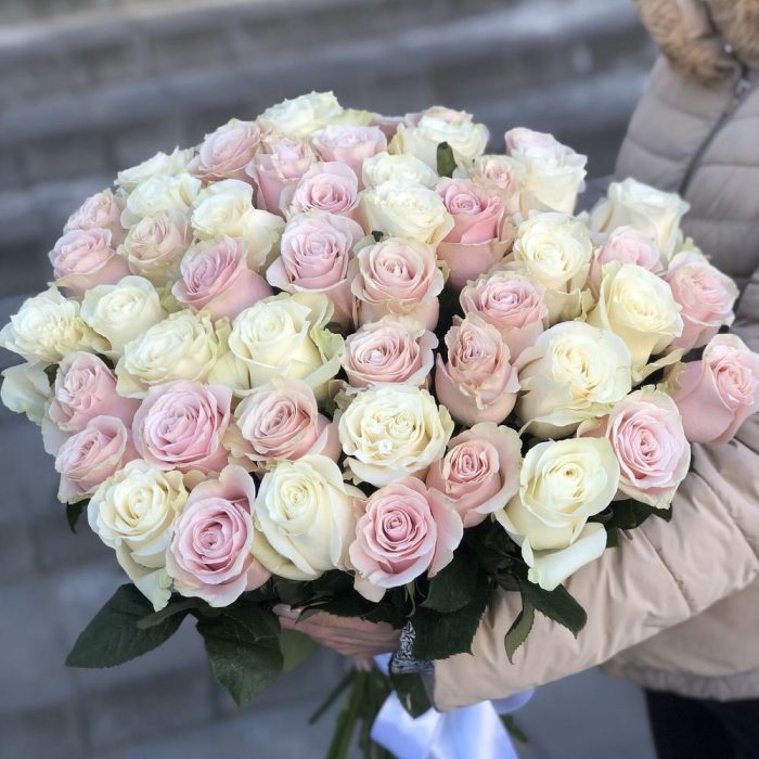 Букет из 51 бело-розовой розы сорта Mondial и Pink Mondial