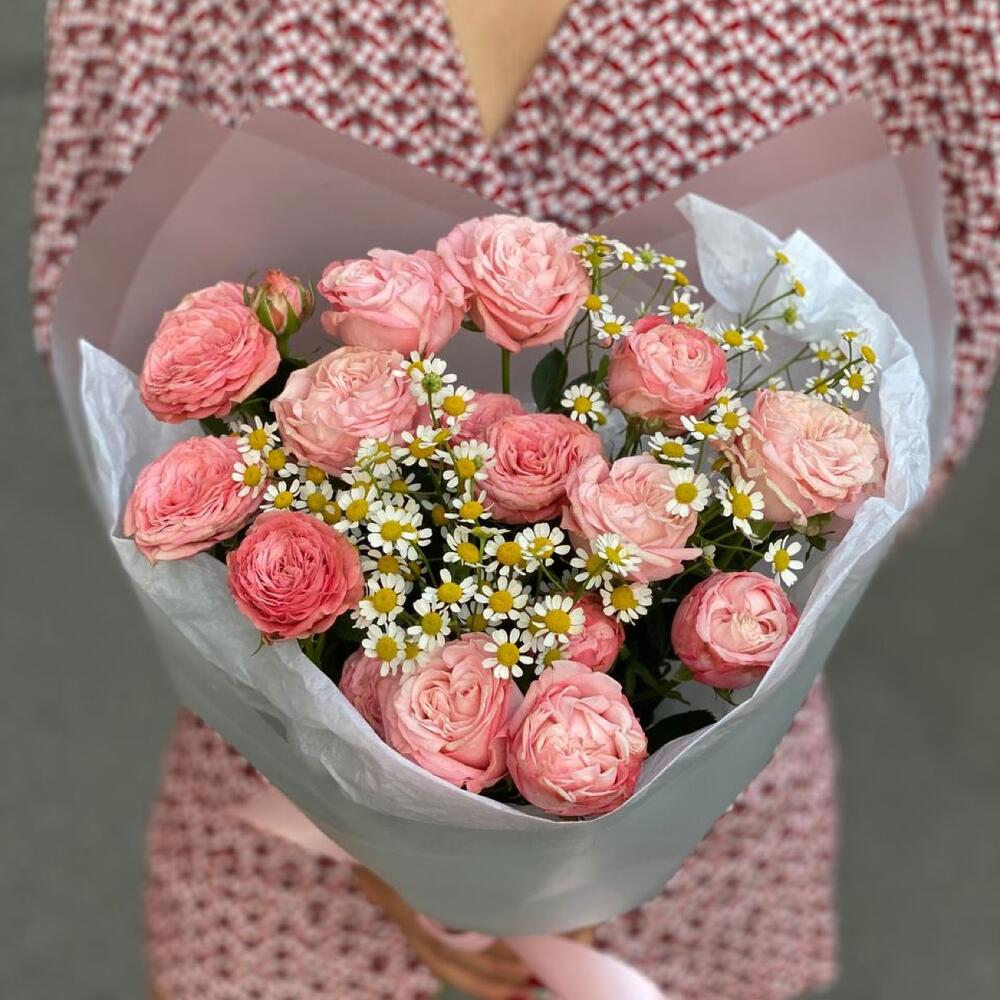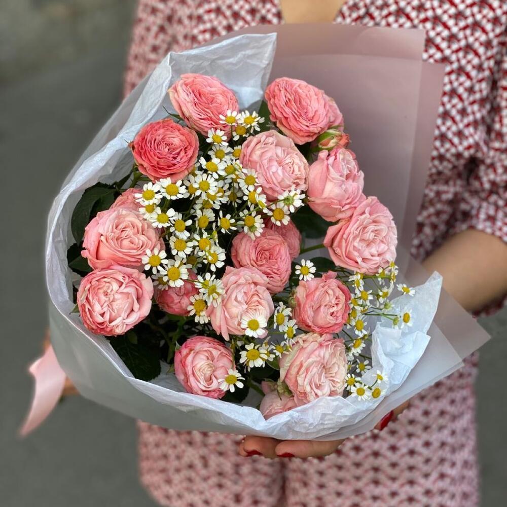 Матрикария – 2 шт.Упаковка дизайнерская – 1 шт.Роза бомбастик кустовая – 3 шт.