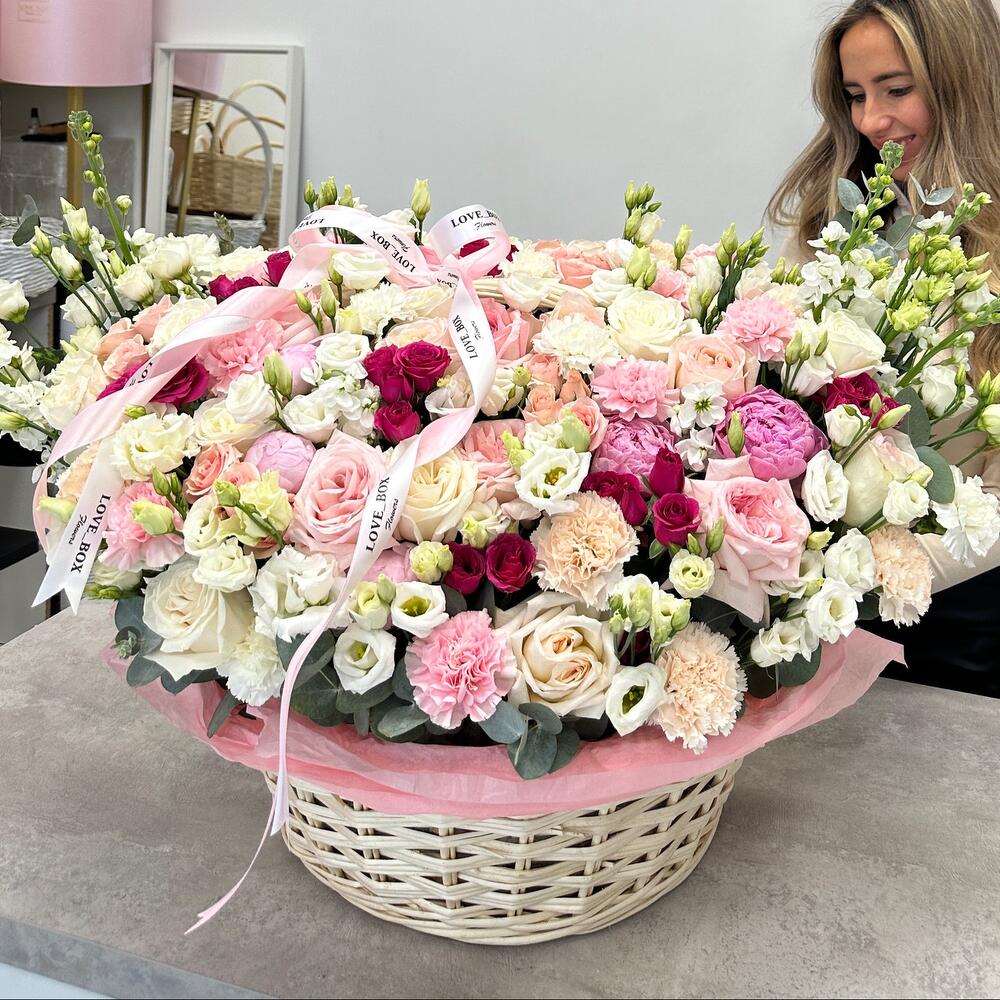 Пионовидная роза – 15 шт.Эквадор роза – 15 шт.Пион – 5 шт.Кустовая роза – 10 шт.Лизиантус – 15 шт.Диантус – 15 шт.Маттиола – 10 шт.Эвкалипт – 10 шт.Корзина плетеная – 1 шт.