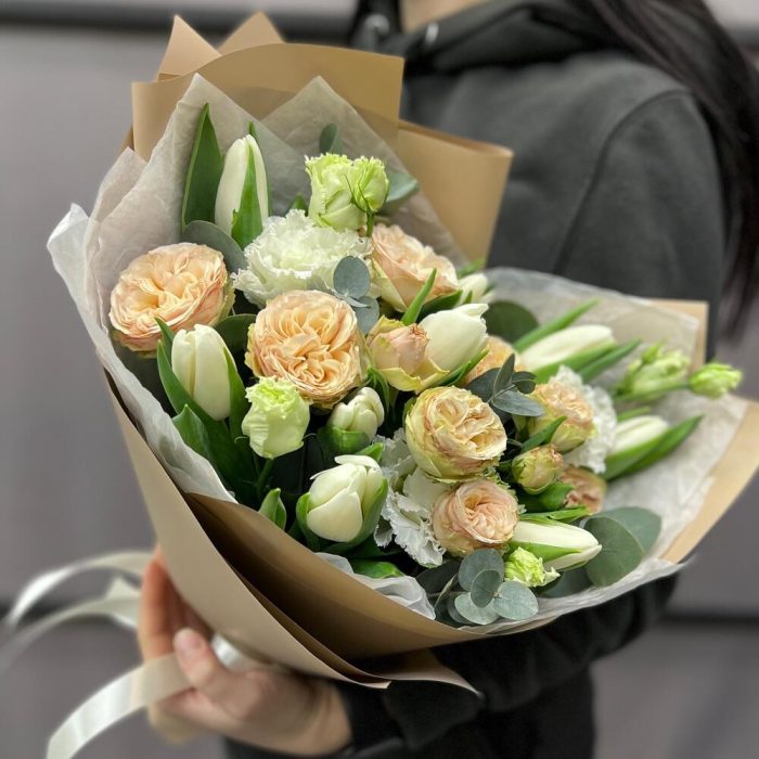 Эвкалипт – 2 шт.Лента атласная – 2 шт.Тишью – 2 шт.Тюльпан белый – 9 шт.Пленка матовая – 3 шт.Эустома белая махровая – 1 шт.роза кустовая пионовидная трендсеттер – 2 шт.