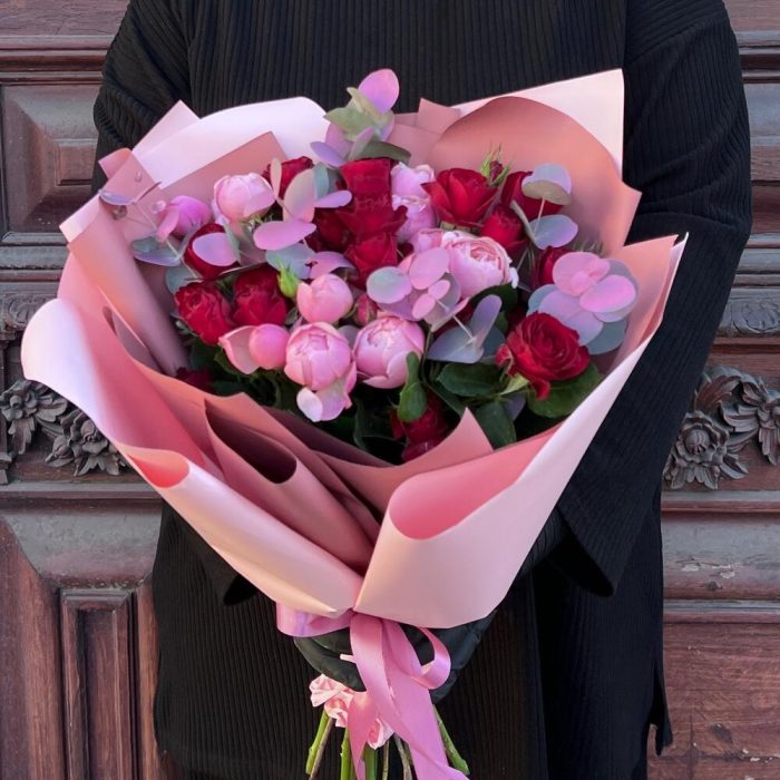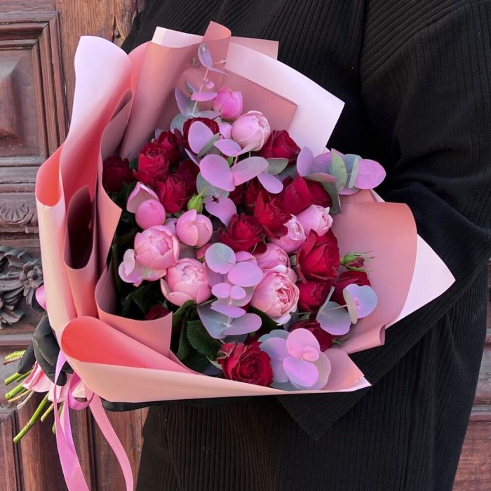 Лента атласная – 2 шт.Пленка матовая – 7 шт.Эвкалипт крашеный – 3 шт.роза кустовая пионовидная сильва пинк – 4 шт.роза кустовая ред трендсеттер – 5 шт.