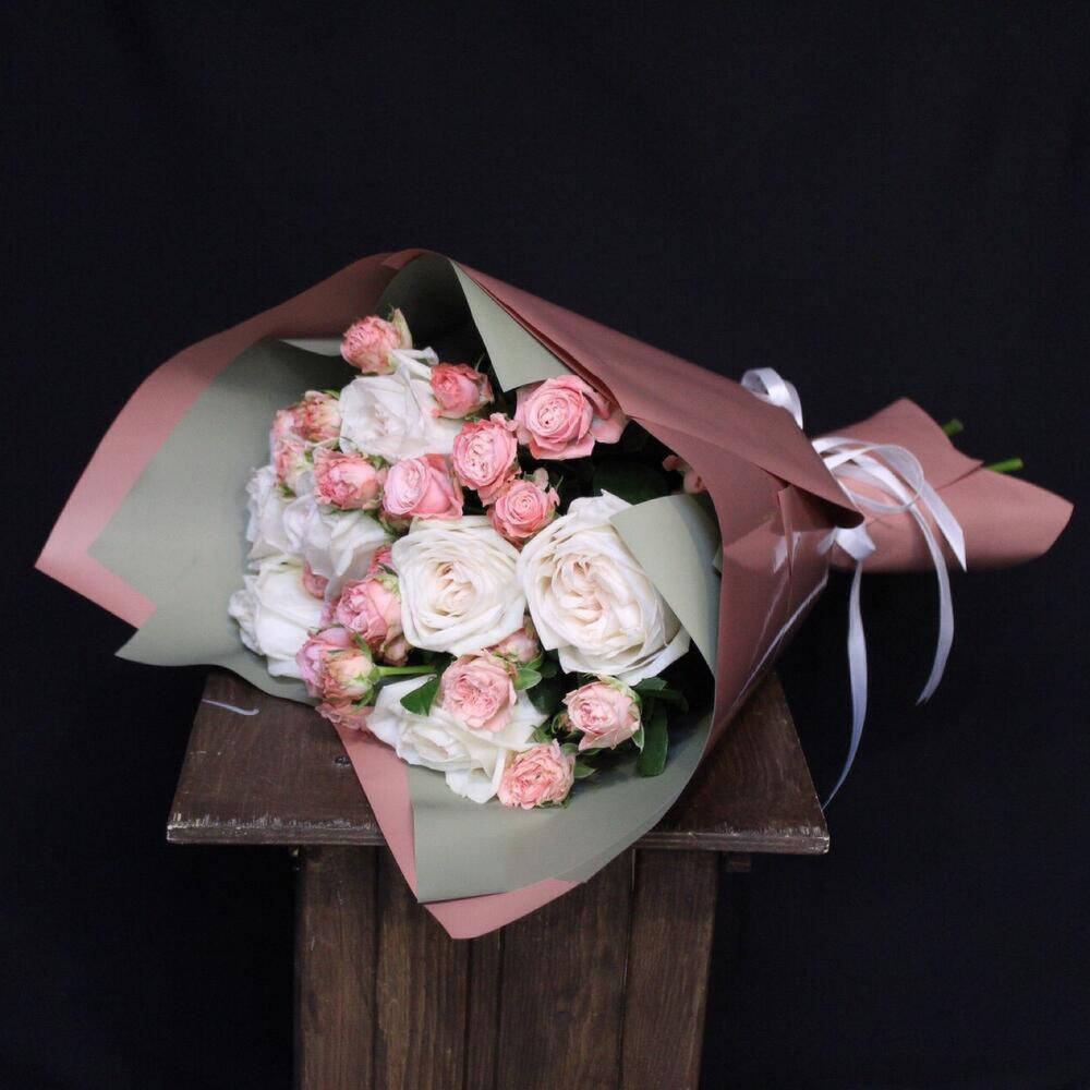 роза пионовидная white o’hara – 7 шт.Роза кустовая пионовидная мадам бомбастик – 5 шт.Пленка дизайнерская – 5 шт.Лента атласная – 1 шт.