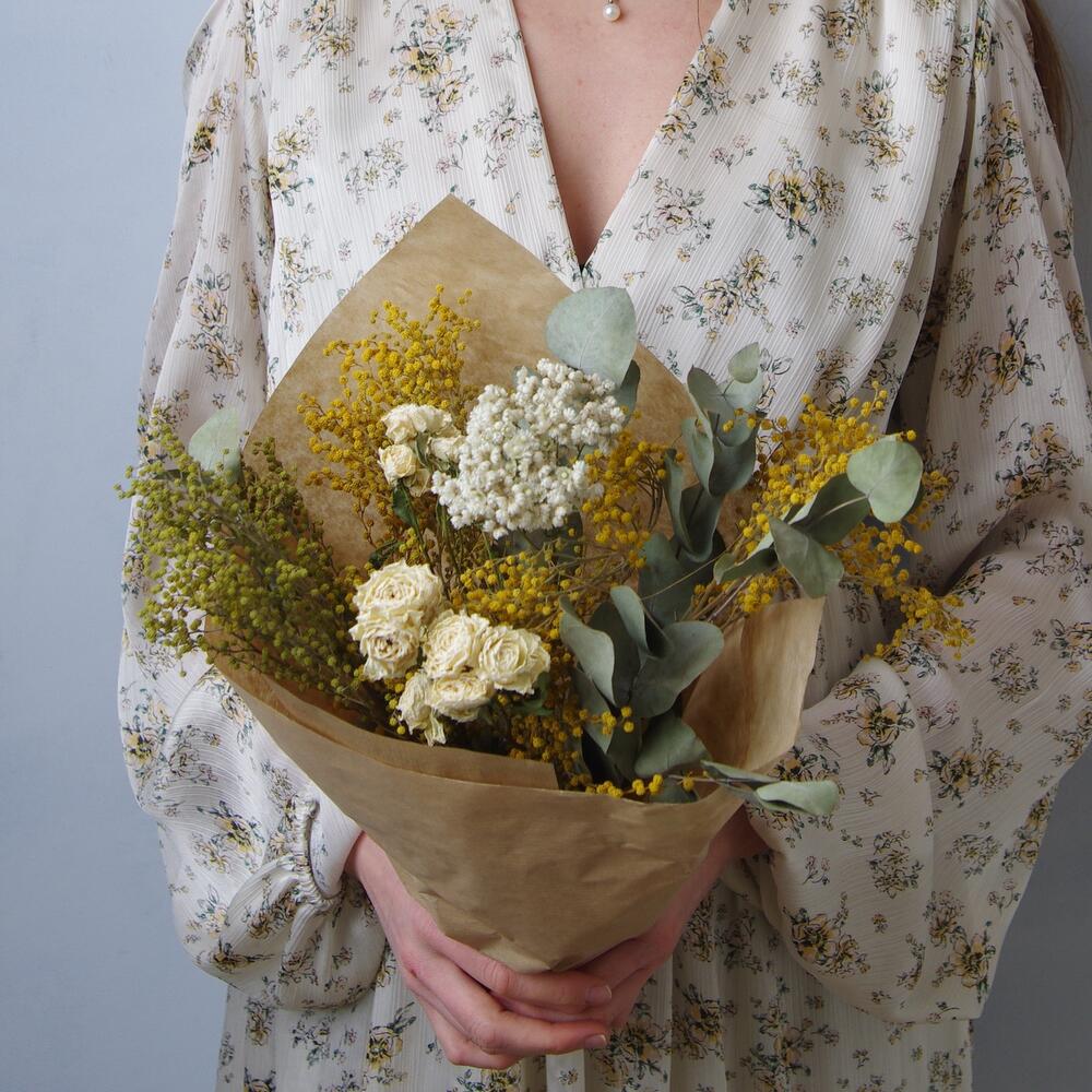 кустовая роза сухоцвет – 3 шт.озотамнус сухоцвет – 1 шт.эвкалипт сухоцвет пучок – 1 шт.мимоза пучок сухоцвет – 1 шт.Крафт упаковка – 1 шт.транспортировочная упаковка – 1 шт.