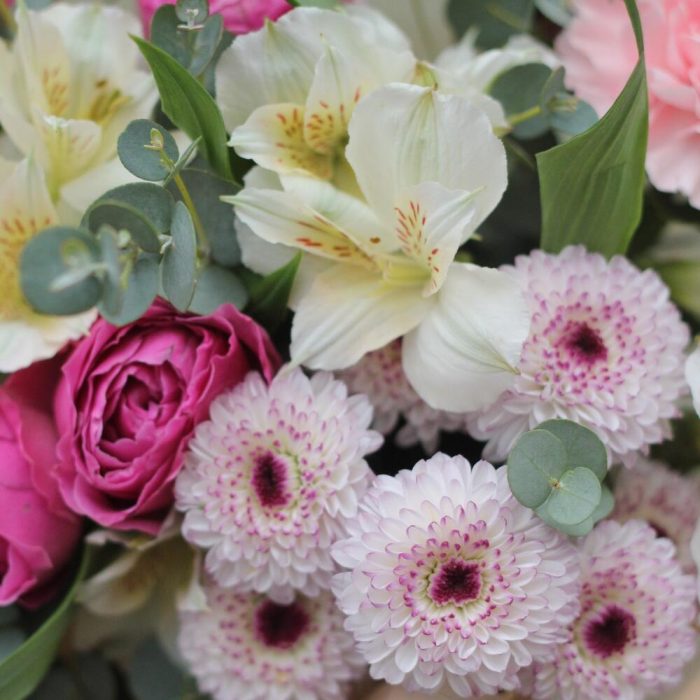 Роза пионовидная кустовая – 2 шт. Альстромерия – 2 шт. Диантус розовый – 2 шт. Хризантема Сантини – 1 шт. Эвкалипт Гунни – 3 шт.