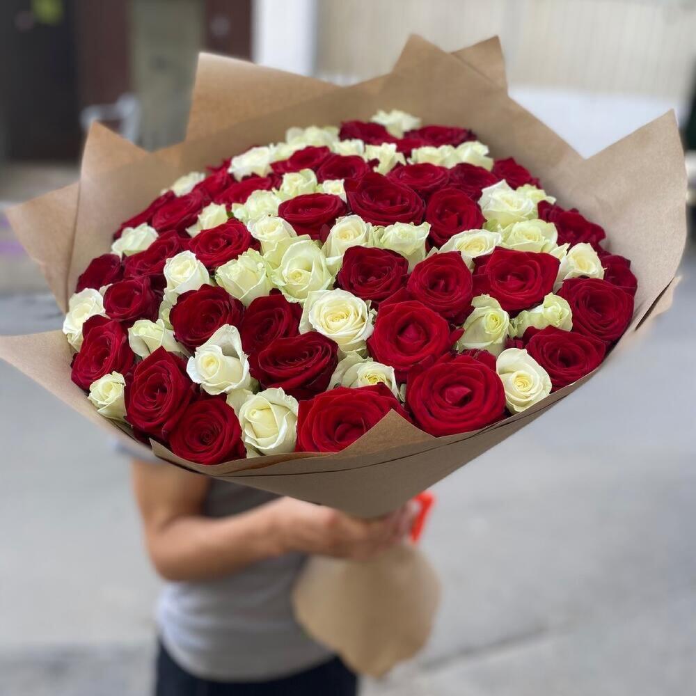 розы эквадор (60 см) – 51 шт.Упаковка дизайнерская – 2 шт.Лента атласная – 1 шт.