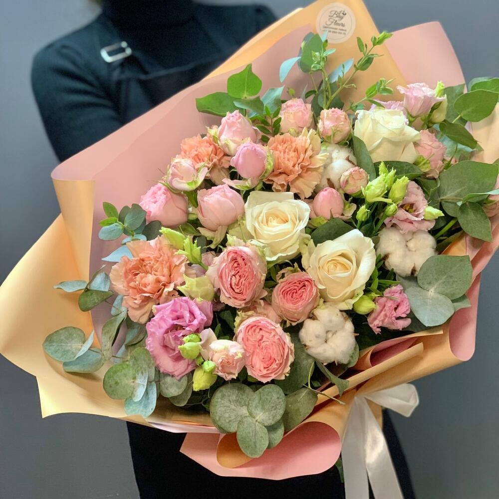 Роза – 3 шт.Роза кустовая – 3 шт.Гвоздика – 3 шт.Эустома – 3 шт.Хлопок натуральный – 5 шт.Эвкалипт – 3 шт.Упаковка дизайнерская – 1 шт.