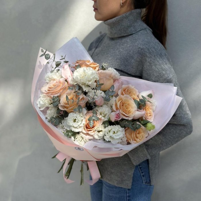 Альстромерии, Гвоздики, Кустовые розы, Лизиантусы, Розы, Хризантемы