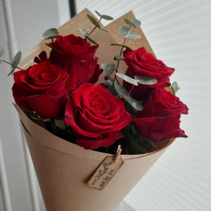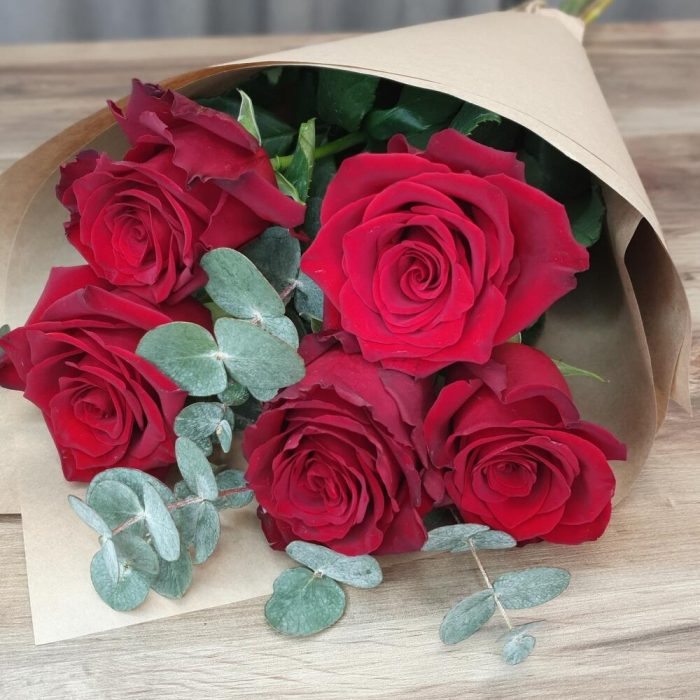 Роза – 5 шт.Эвкалипт – 2 шт.Крафт упаковка – 1 шт.