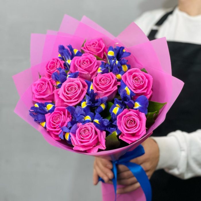 Букет из роз и ирисов . Розы. Ирисы