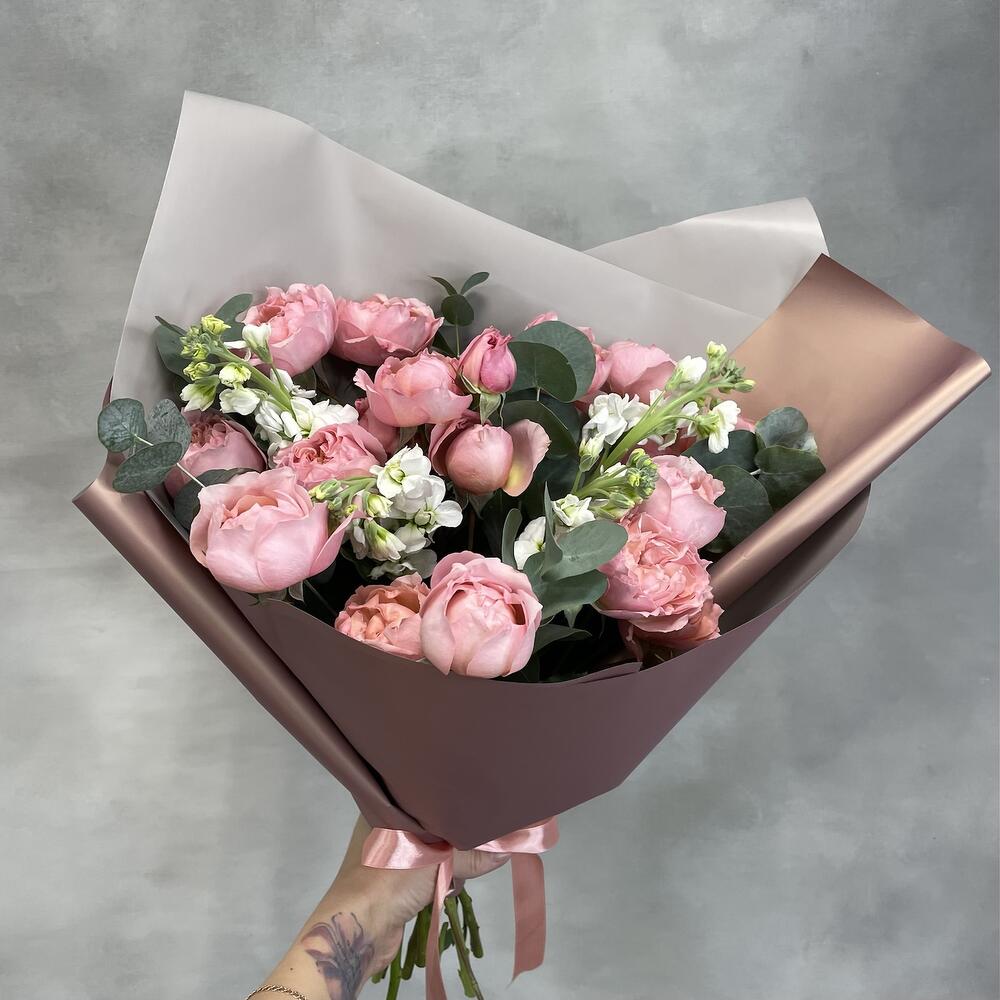 Роза кустовая пионовидная джульетта – 5 шт.Маттиола – 4 шт.Эвкалипт – 3 шт.Упаковка – 1 шт.
