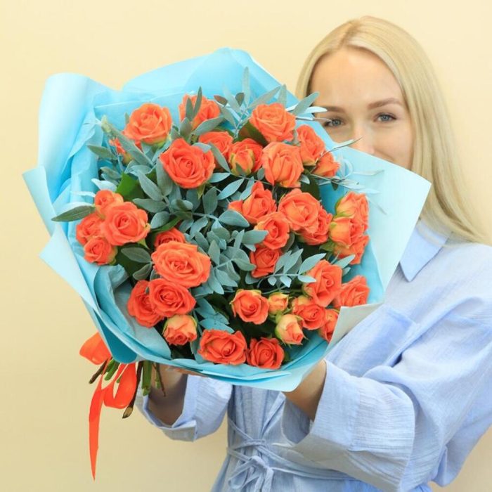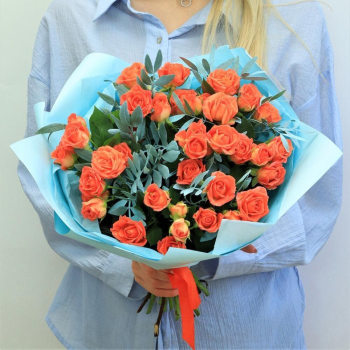 Роза кустовая оранжевая – 9 шт. Эвкалипт – 3 шт. Дизайнерская упаковка – 1 шт. Открыточка с вашими пожеланиями – 1 шт.