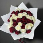 Упаковка – 1 шт. Атласная лента – 1 шт. Красная роза – 17 шт. белая роза – 20 шт.