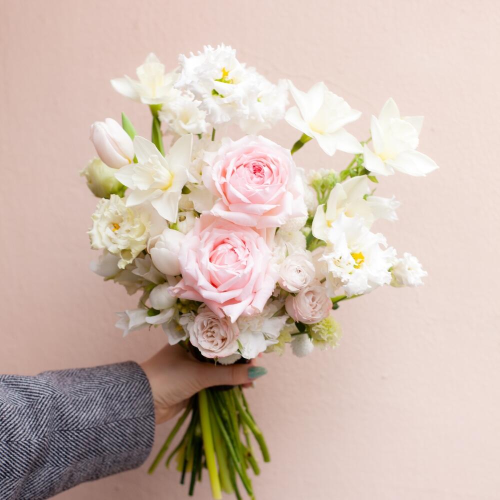 Лента – 1 шт.Лизиантус – 4 шт.Нарцисс – 5 шт.Роза кустовая – 3 шт.Роза пионовидная – 3 шт.Тюльпан белый – 7 шт.Транспортировочная коробка – 1 шт.Тюльпан фокстрот – 5 шт.