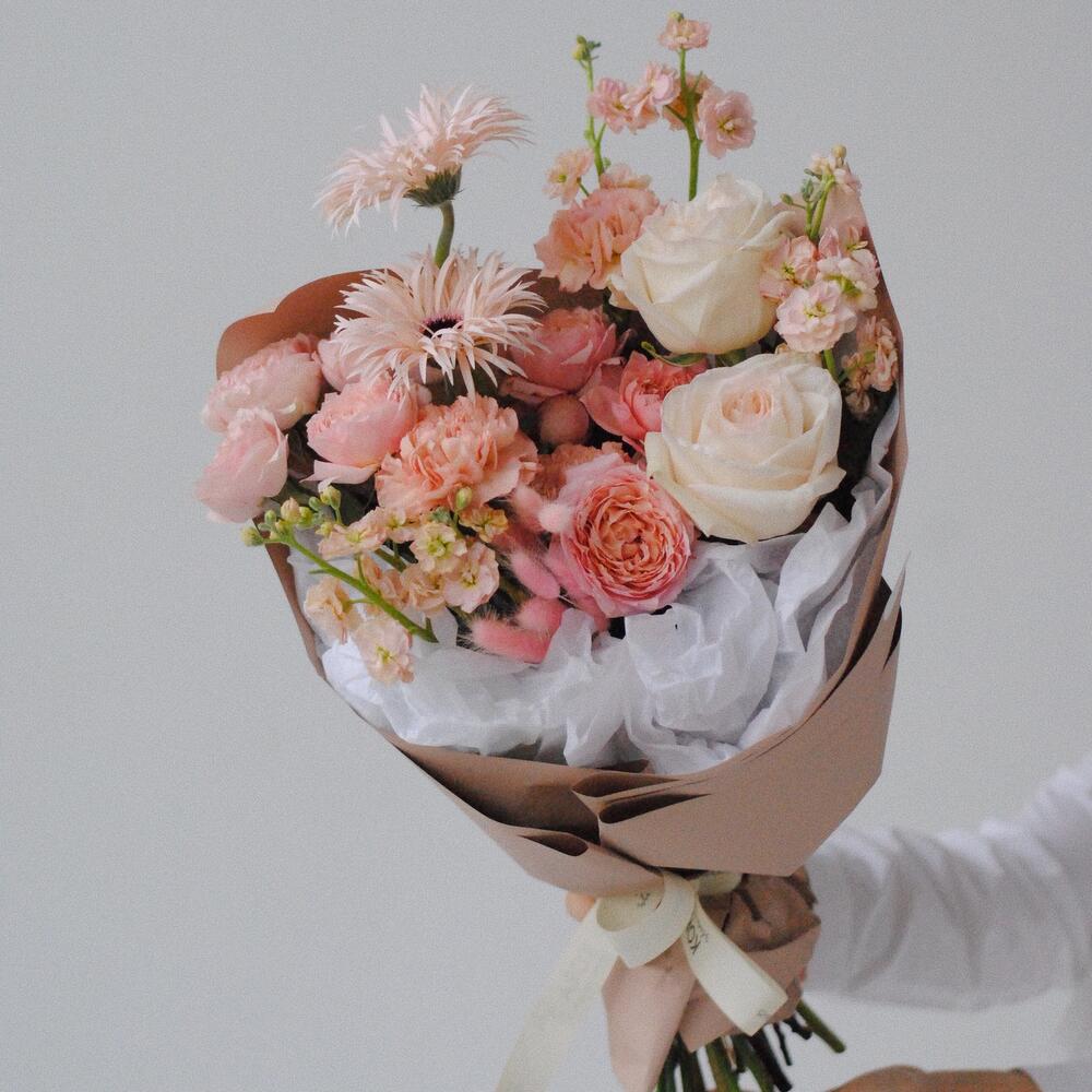 Гербера – 2 шт.Кустовая роза – 2 шт.Роза – 2 шт.Маттиола – 4 шт.Лагурус – 7 шт.Упаковка дизайнерская – 1 шт.