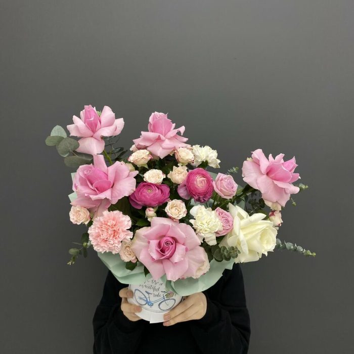 Альстромерии, Гвоздики, Кустовые розы, Лизиантусы, Розы, Хризантемы