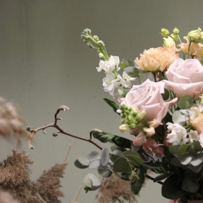 Ранункулюс (лютик) – 1 шт.Роза сортовая – 2 шт.Нарцисс кустовой – 2 шт.Маттиола – 1 шт.Львиный зев – 1 шт.Зонтик – 3 шт.Лизиантус – 2 шт.Эвкалипт – 3 шт.Ветви – 2 шт.Лента – 1 шт.