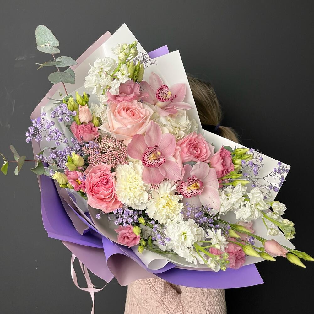 Гипсофила – 2 шт.Гортензия – 1 шт.Лизиантус – 2 шт.Маттиола – 3 шт.Озотамнус – 1 шт.Эвкалипт – 3 шт.Роза – 3 шт.Диантус – 2 шт.Фисташка – 5 шт.ЦИМБИДИУМ – 3 шт.Упаковка дизайнерская – 4 шт.