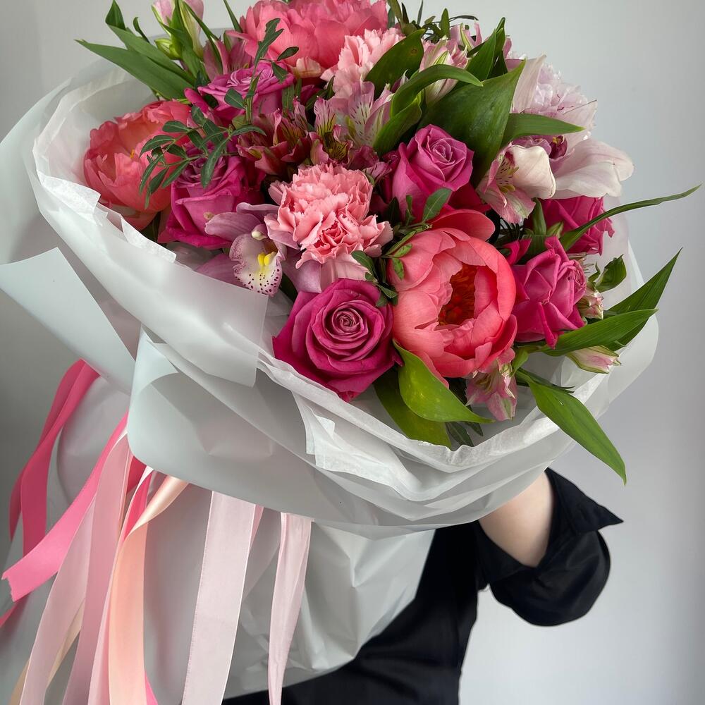 Альстромерия – 4 шт.Орхидея Цимбидиум – 2 шт.Пион – 4 шт.Пленка – 6 шт.Роза Россия – 5 шт.Фисташка пучок – 1 шт.Диантус сортовой – 2 шт.