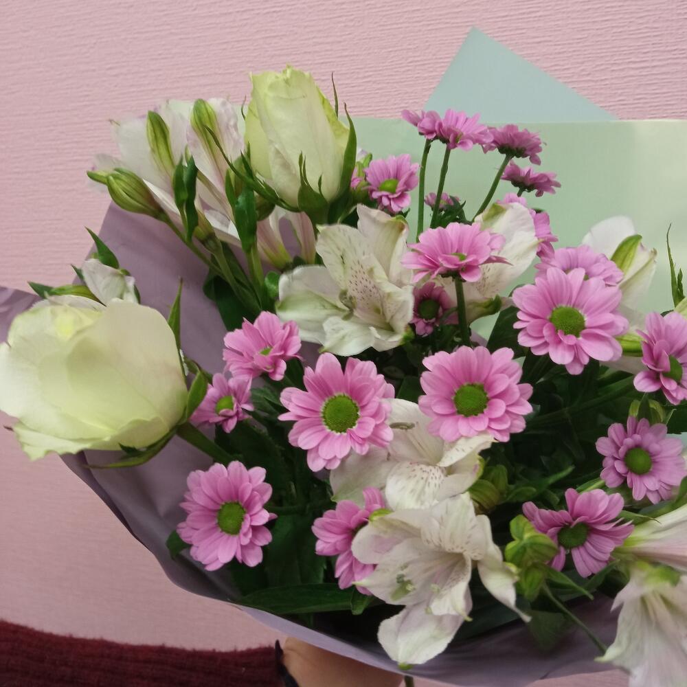 Альстромерия – 3 шт.Лента – 1 шт.Роза – 3 шт.Упаковка – 1 шт.Хризантема кустовая Сантини – 3 шт.