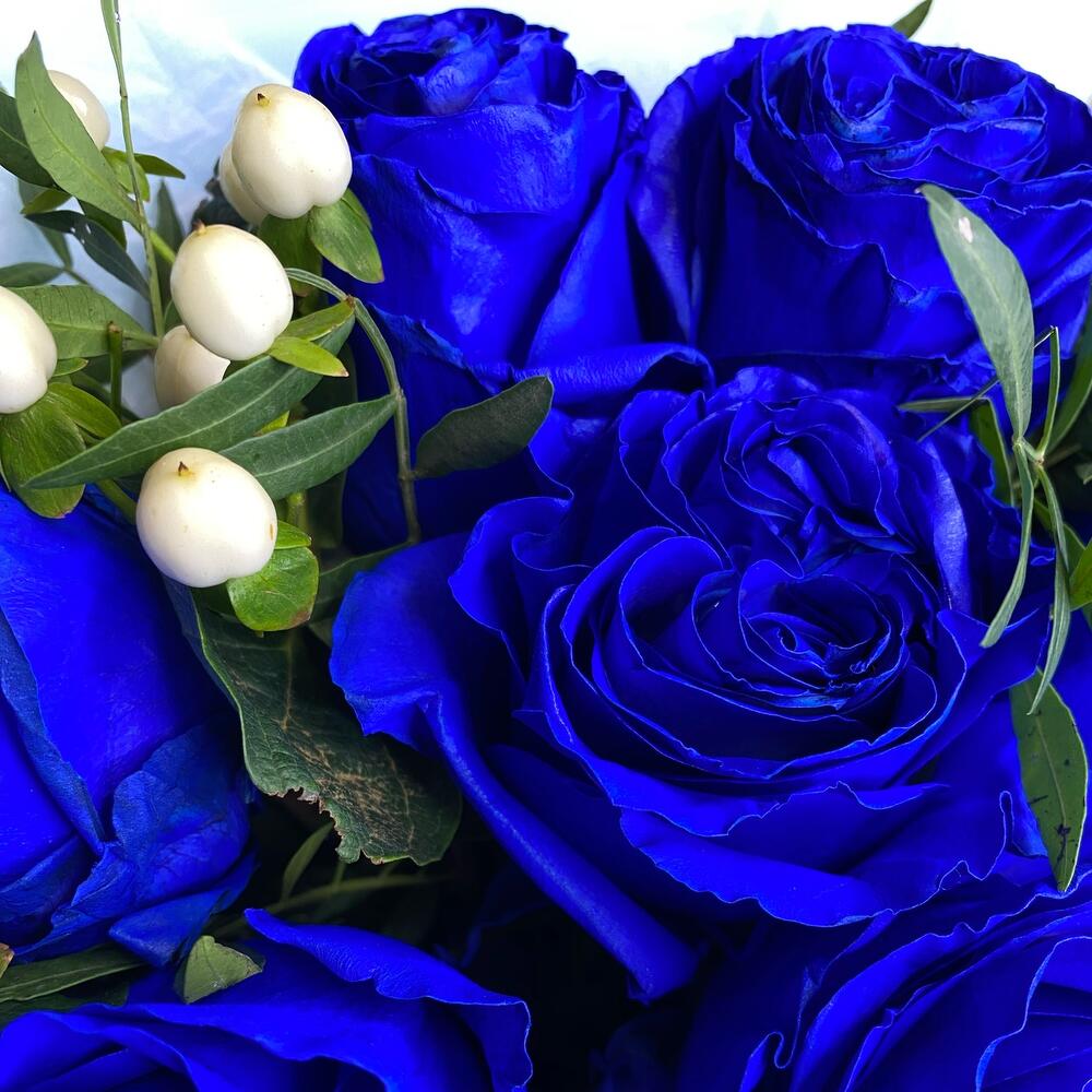 Гиперикум – 3 шт.Лента атласная – 1 шт.Тишью – 1 шт.Фисташка – 2 шт.Синяя роза – 7 шт.Матовая упаковка – 1 шт.